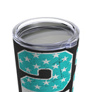 The tumbler features a striking design that raises awareness about PTSD and the alarming statistic of '22 A Day'—representing the number of veterans who tragically take their own lives due to mental health struggles. Against a bold black background, the design showcases powerful blue graphics that demand attention and spark conversations about this important issue.