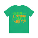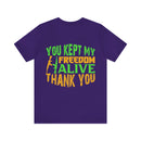 Celebrate the spirit of freedom and express your heartfelt gratitude with our "Preserving Freedom: Thank You for Keeping It Alive" Military Design T-Shirt. This classic unisex jersey short-sleeve tee is designed to fit like a cherished favorite, providing ultimate comfort and style.