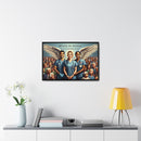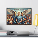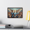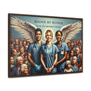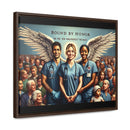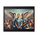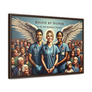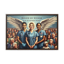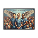 This artwork represents the noble spirit of healthcare workers, portraying them as guardian angels who serve with honor and dedication. The wings symbolize their role as protectors and saviors, often putting the needs of their patients above their own. The diverse assembly of individuals behind them illustrates the vast swath of humanity that healthcare workers serve, embodying the universality of their commitment. The scene evokes a sense of solidarity, reverence, and deep appreciation for those in the medical profession who are bound by a sense of duty to safeguard the health of the community. The text “BOUND BY HONOR” arches above, with the phrase “WE THE FEW WHO PROTECT THE MANY” underneath, suggesting a noble and selfless commitment to the well-being of others. The framed canvas would serve as a powerful tribute to the tireless work and the compassionate care provided by these individuals.